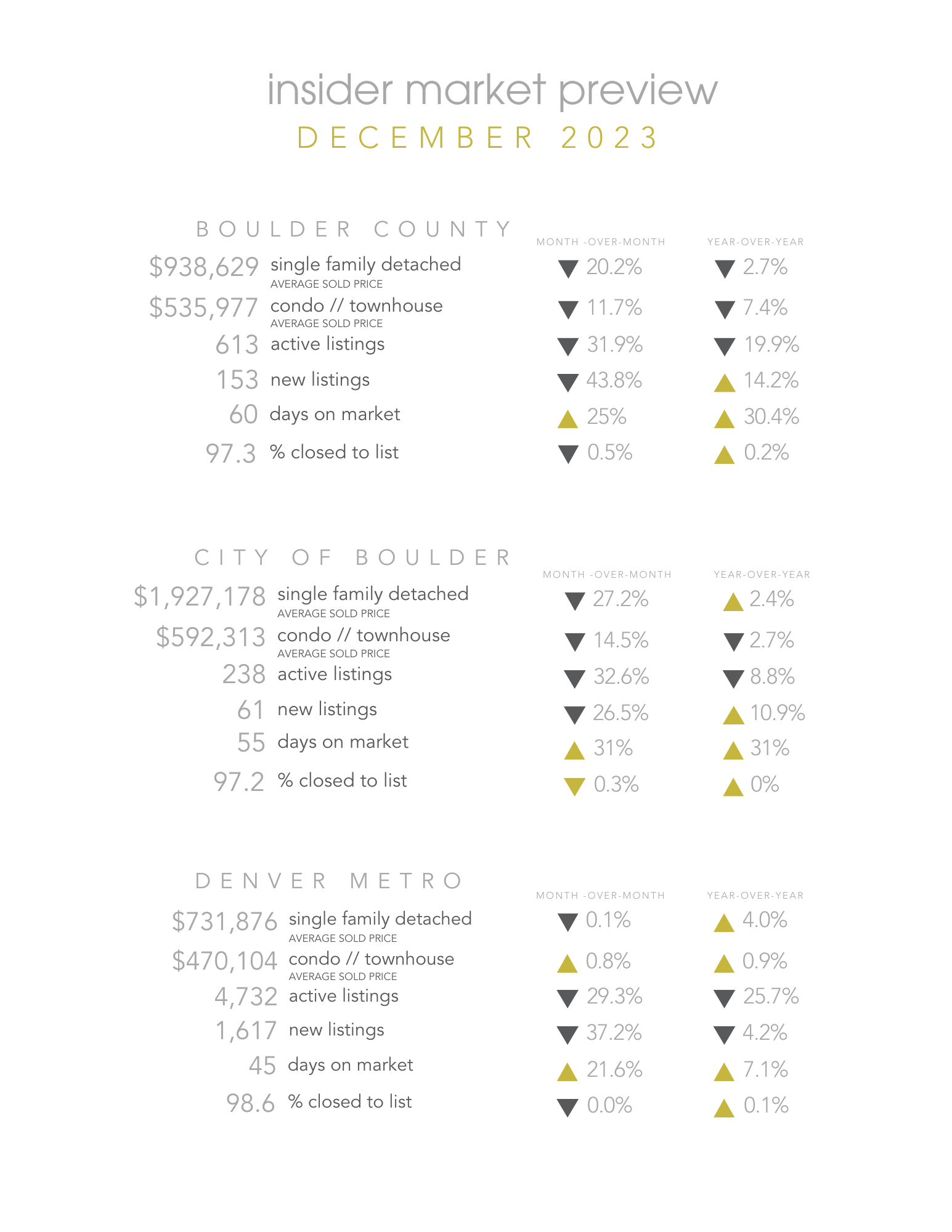 january ‘24 market update // what a year… Jan 18 Written By Colin Dart Boulder // Denver market update + statistics + local insights The most expensive home sold in Denver area this year was $15M. In Aspen, it was five times that. Denver receives record number of applications from landlords looking for new rental licenses Two Nederland residents appointed as “guardians” of Boulder Creek, giving it a voice in town policy Colin Dart